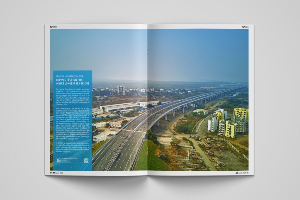 El Mumbai Trans Harbour Link, el puente marítimo más largo de la India con 21,8 km, se construyó en Bombay entre 2016 y 2023. Para proteger el puente de las influencias ambientales nocivas del mar, se utilizó el revestimiento de protección superficial del hormigón EmceColor-flex (conocido como MC-Color flex fuera de la India). Este revestimiento ofrece una gran resistencia a las sales y los cloruros y se ha convertido en el estándar para diversas estructuras en la India.